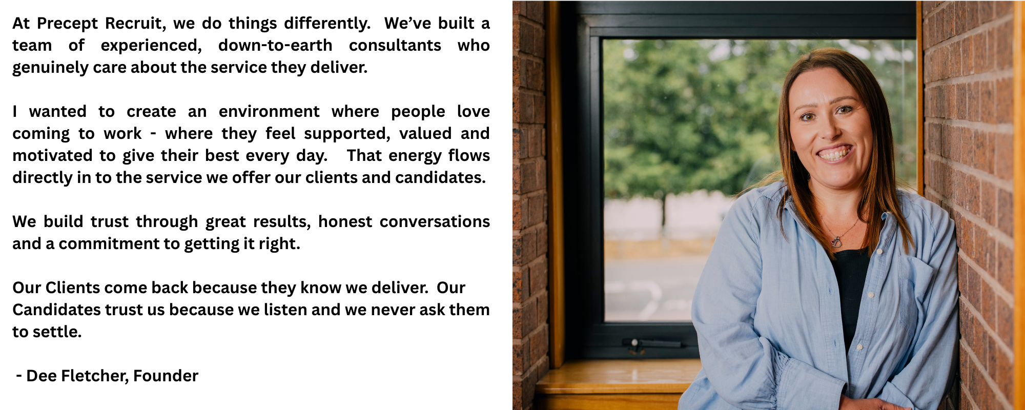 At Precept Recruit, relationships are everything. They guide our decision, shape our service, and define our success. Whether you're a client or candidate, we take the time to understand your goals, values and challenges - so we can deliver recruitment solutions that truly fit. With a consultative approach and a long-term mindset, we help build high-performing teams that drive sustainable success. We go one step further, recognising opportunities for growth and collaboration - we take pride in connecting our networks together.